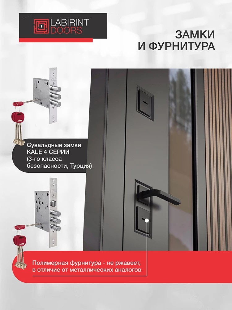 - Полный комплект Черная фурнитура (полимерная): накладки сувальдные со шторкой, дверная ручка, ночная задвижка, металлический эксцентрик с защитной вставкой.