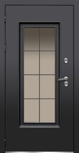 - Покрытие внеш./ внутр.: «МУАР AKZO NOBEL RAL 9005» + грунт-барьер «AKZO NOBEL», трехкамерный стеклопакет, тонировка Бронза + ковка Британия / 16 мм панель в цвете Белый матовый