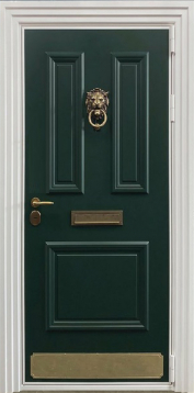 Внешняя отделка: МДФ-панель(16 мм) с объемными багетами, Эмаль цвет Зеленый + Белые фигурные наличники металл;