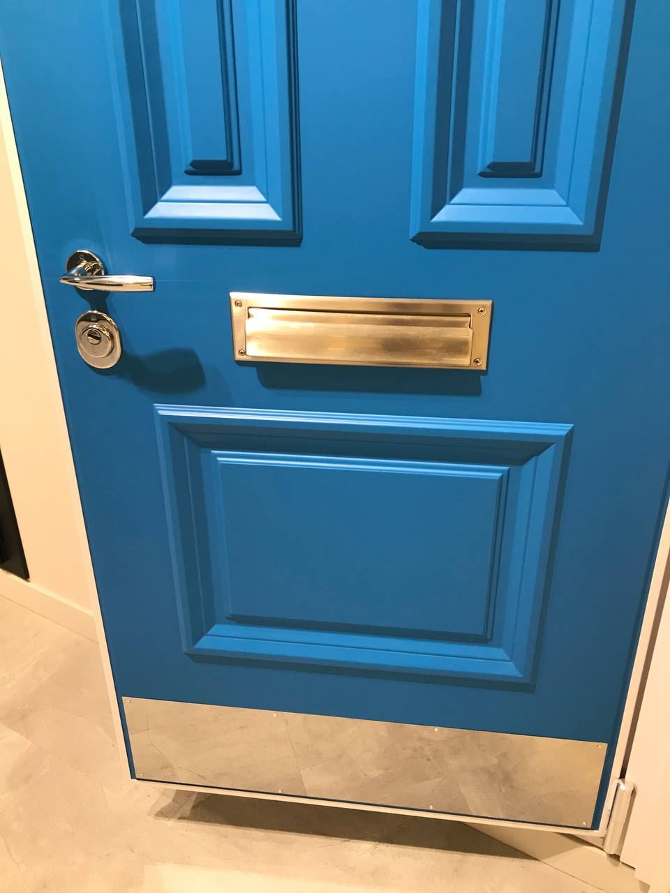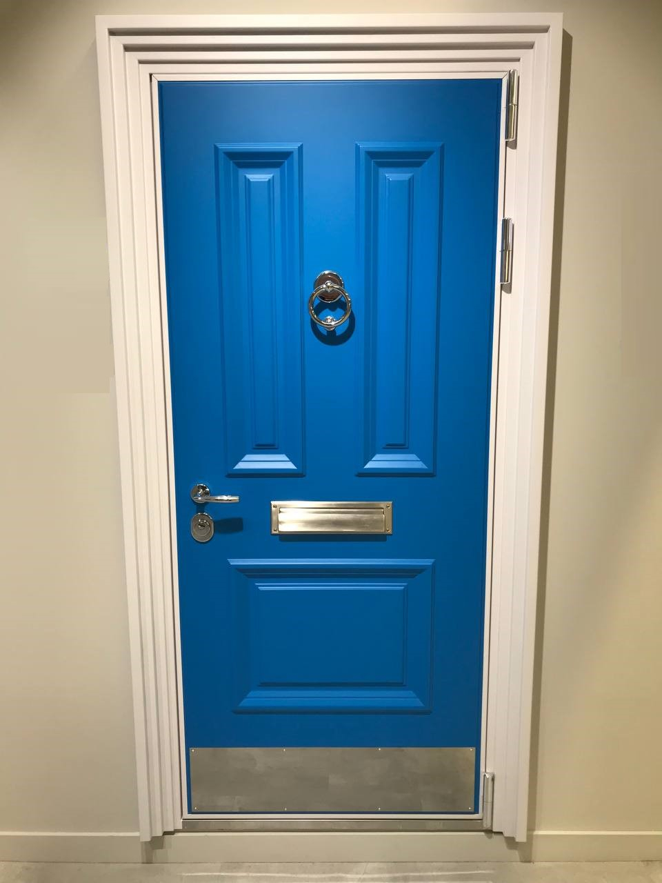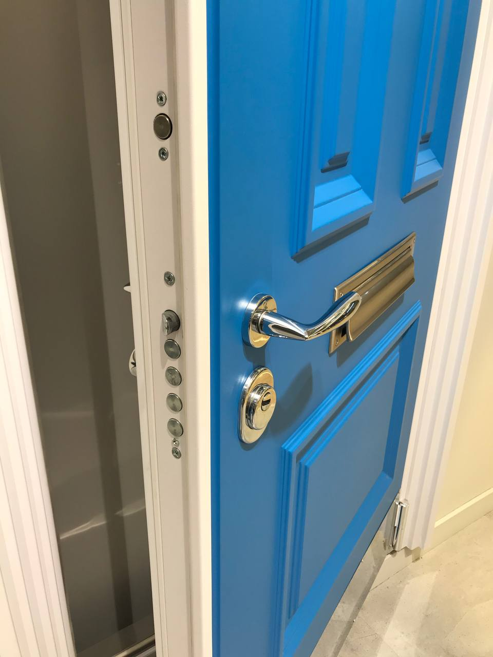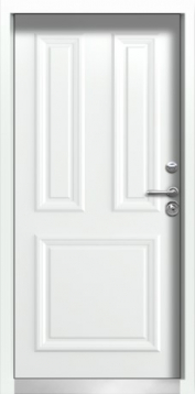 Внешняя отделка: МДФ-панель(16 мм) с объемными багетами, Эмаль цвет Синий Ral 5015 + Белые фигурные наличники металл;